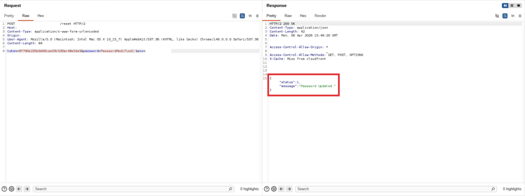 Sara extracted the token, injected it into the password reset request, and successfully changed the admin account’s password.