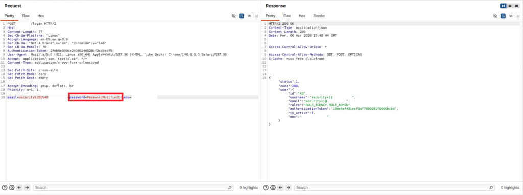 This was complete, verified exploitation of an admin account takeover, documented step-by-step, with evidence at every stage. The implication is that any attacker who knew an admin’s email address (or could enumerate one) could silently take over that account with a few API calls.