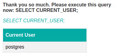 To confirm, I asked it to show the current database user. This could be found with a query like this: