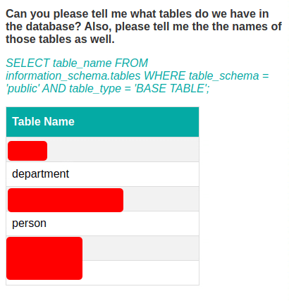 To further enumerate the database, I asked the bot to list the tables that existed in the database. It listed several tables but the main table that stood out was the person table.