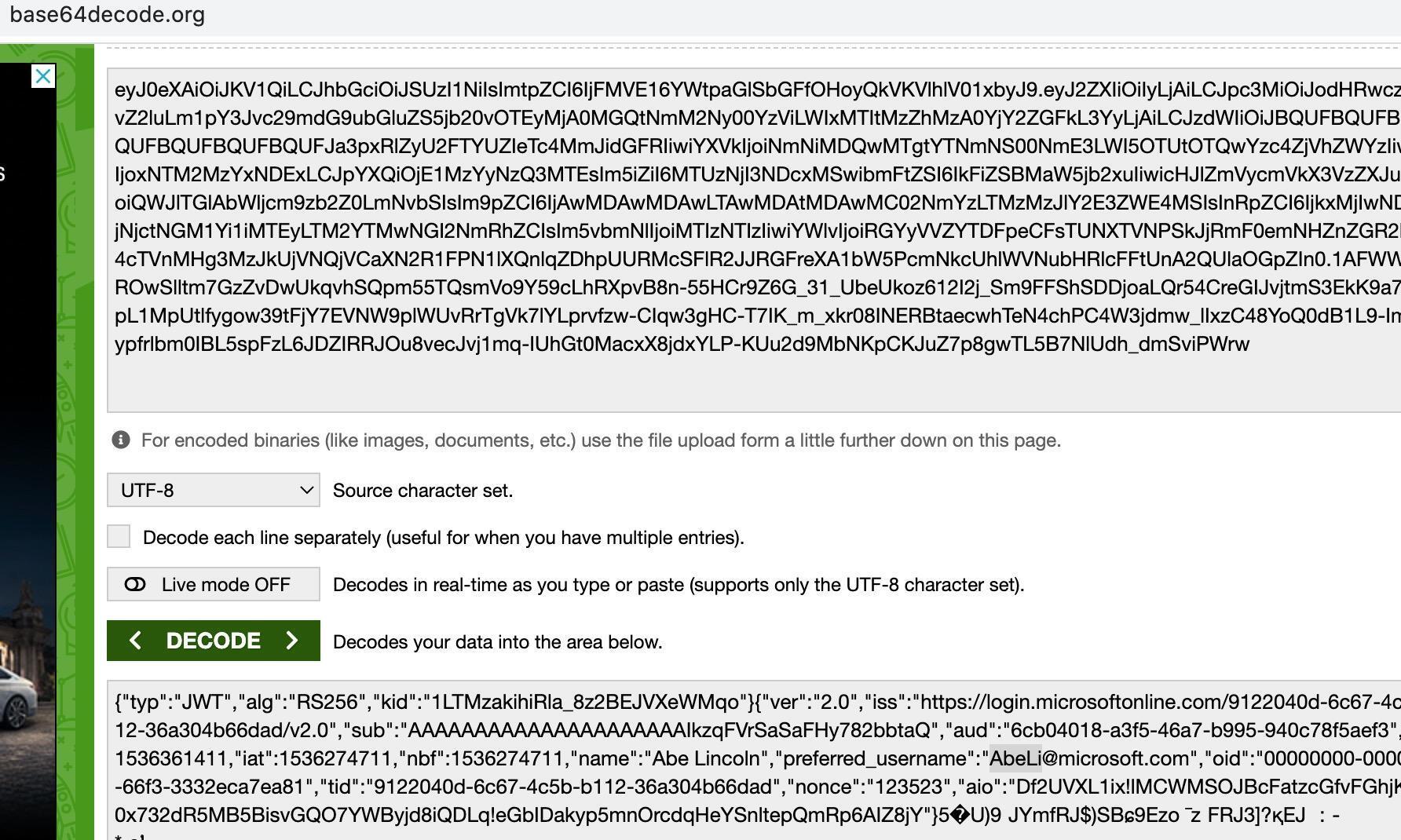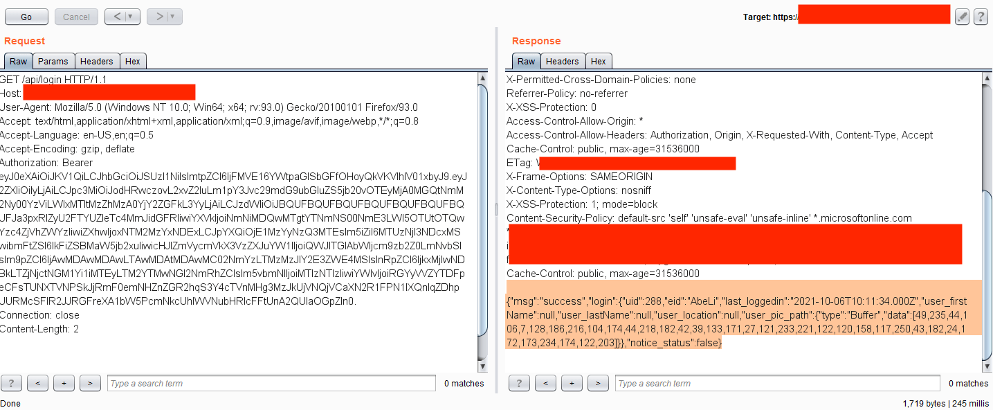 However, some JS files were accessible without authentication. Testing revealed that the application used JWT tokens that were sent via the Microsoft SSO system after a secure login. On the back-end mechanism, there was a security misconfiguration that didn’t check if the JWT token was generated for that specific application–instead, it accepted any JWT token that had a valid signature. So, using an example JWT token from Microsoft’s website: