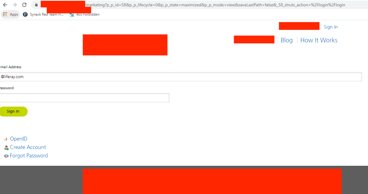 For those not familiar with Liferay, the CMS uses portlets for application workflow, which have a parameter as p_p_id within numeric numbers. For that application, it was possible to access the login portlet by changing the parameter to value 58. On the normal login page, only the login form was accessible. However, by accessing the portlet directly, it was possible to reach the Create Account functionality, which then allowed self-registration to access internal applications without proper authorization.