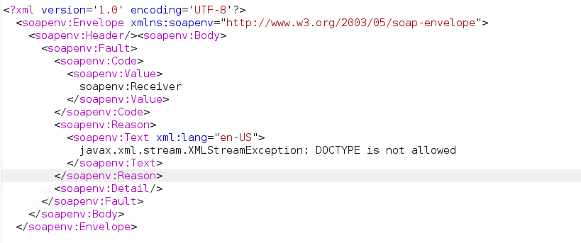 After sending the very first request, I noticed that the application was using SOAP API to transfer the data. I tried to perform XXE in the SOAP body but the application threw an error saying “DOCTYPE is not allowed”.