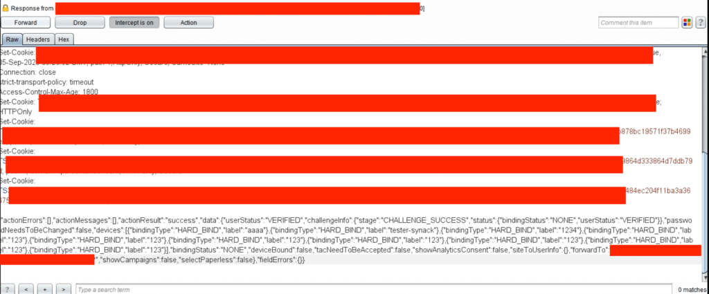 Unfortunately for me, it wasn’t that easy. Because some other parameters were kept at “localStorage” within the browser, the app would redirect to the login page if the “actionResult” parameter was changed. However, copying and pasting the full response of the success message at the failed code request would allow attackers to bypass the MFA confirmation. This showed that cookies generated for the session did not check to see if the OTP was correct or incorrect on the back end. Instead, it trusted client-side controls only, which can be tampered with.