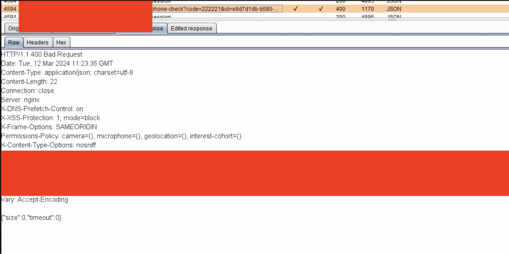 This could be bypassed using a response tampering attack. All I had to do was change the HTTP status response code from “400 Bad Request” to “200 OK” and set the “size” parameter to “1” from “0”. Since client-side code on the web browser were only checking whether response had returned size parameter as “1” to control success/fail MFA conditions, and were not saving the actual state of the MFA at the back end, it was possible to bypass the client side security controls within tampering the back end responses coming to the web browsers.