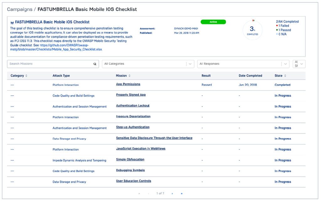 Through the Synack Catalog, SRT researchers can be activated to run vulnerability checklists like OWASP Top 10 and NIST 800-53, document their work, and generate reports to demonstrate adherence to regulatory standards and security controls.