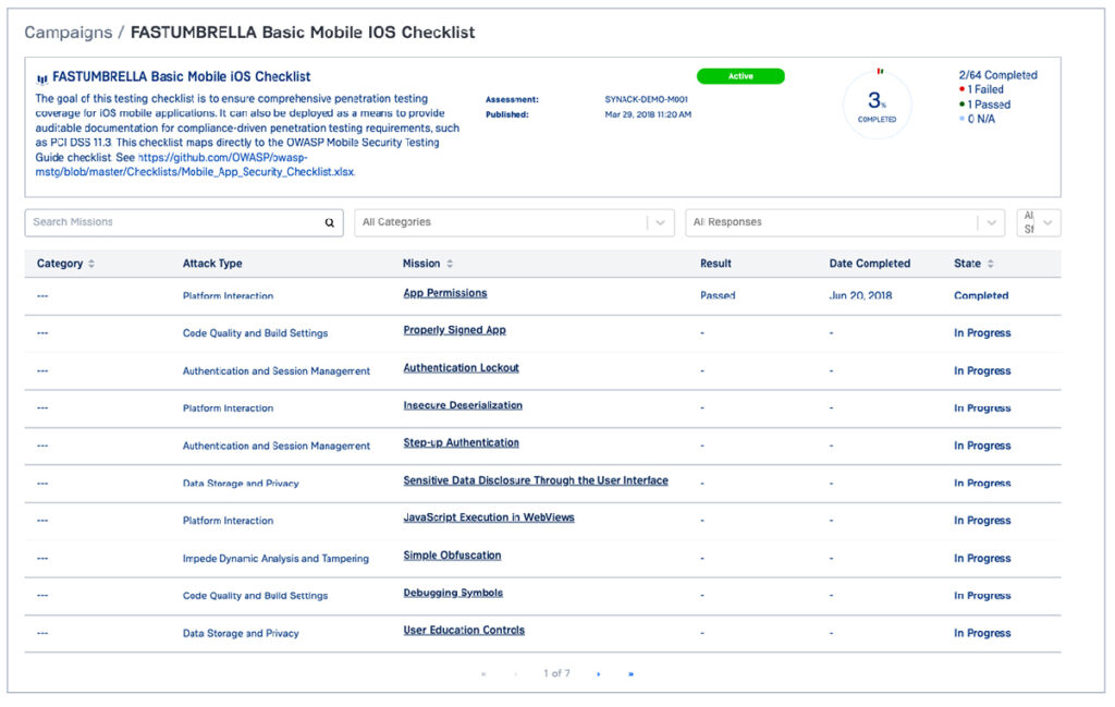 Synack Missions can be launched in seconds to demonstrate adherence to regulatory standards and security controls by utilizing the Synack Red Team (SRT) to complete specific tasks and provide documentation of their work. Missions include a report with documentation and data suitable for NIST, PCI and OWASP (WSTG, MSTG, ASVS).